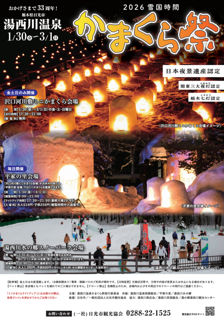 栃木県日光市の湯西川温泉かまくら祭は、毎冬開催される人気の冬イベント。